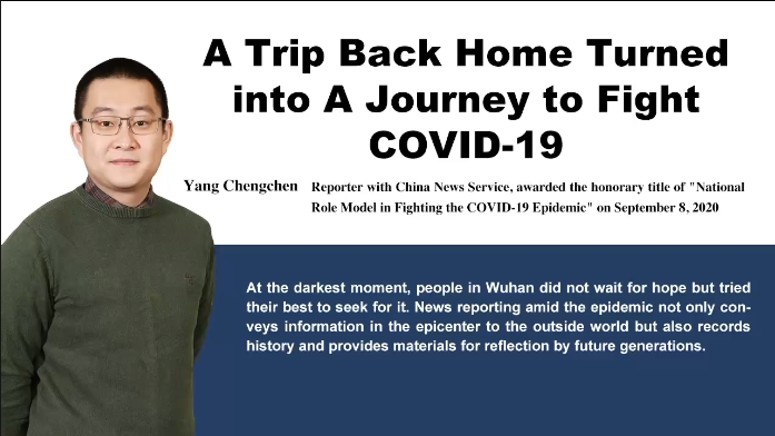 Yang Chengchen is a reporter with China News Service. He went back to his hometown in Wuhan to visit his family on January 21, 2020 and joined the frontline reporting team for the COVID-19 epidemic just the next day. During the 86-day stay in Wuhan, he did a series of timely, objective, factual and professional firsthand reports based on interviews carried out in the epicenter including the Huanan Seafood Market, Wuhan Jinyintan Hospital and Renmin Hospital of Wuhan University. Yang was awarded the honorary title of “National Role Model in Fighting the COVID-19 Epidemic” on September 8, 2020.