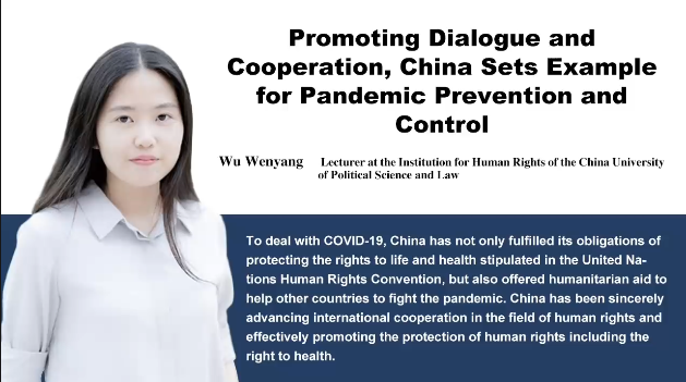 In today's program, we are honored to have Ms Wu Wenyang, Lecturer at the Institution for Human Rights of the China University of Political Science and Law. She will share her thoughts on international communication and collaboration in the field of human rights amid COVID-19.