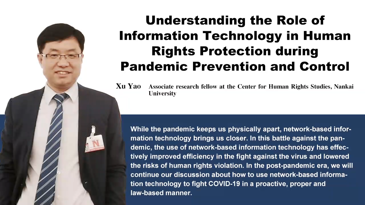 The coronavirus pandemic has raged across the world and become a public health emergency that has drawn worldwide attention. Now, we are still facing great difficulties and challenges in containing the virus. But, compared to the outbreak of SARS 17 years ago, information technology such as artificial intelligence and big data has emerged as a powerful weapon to fight the virus. Today, we are pleased to have Mr. Xu Yao, associate research fellow at the Center for Human Rights Studies, Nankai University. He will share his thoughts on the role of information technology in human rights protection during the fight against the pandemic.