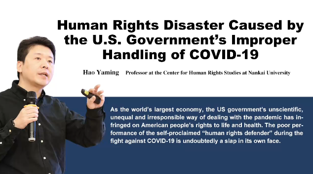 The United States has always thought itself the best defender of human rights, claiming that "All men are created equal" and dictating to other countries. However, since the outbreak of the COVID-19 pandemic, the situation in the United States has been getting worse with social conflicts intensifying. On top of that, the U.S. government has been constantly undermining international cooperation in fight against COVID-19. The pandemic has lifted its hypocritical veil. Its handling of COVID-19 has exposed the hypocrisy of the "American equality" to the rest of the world. Today, we are pleased to have Mr. Hao Yaming from the Center for Human Rights Studies at Nankai University. He will share his thoughts about the so-called "American human rights".