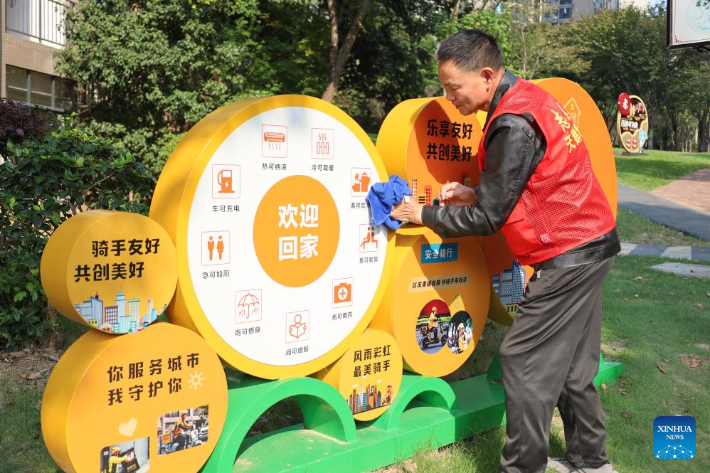 Chen Zhuo cleans a public sign at the Tian'etang Community in Changsha, central China's Hunan Province, Oct. 28, 2025. (Xinhua)