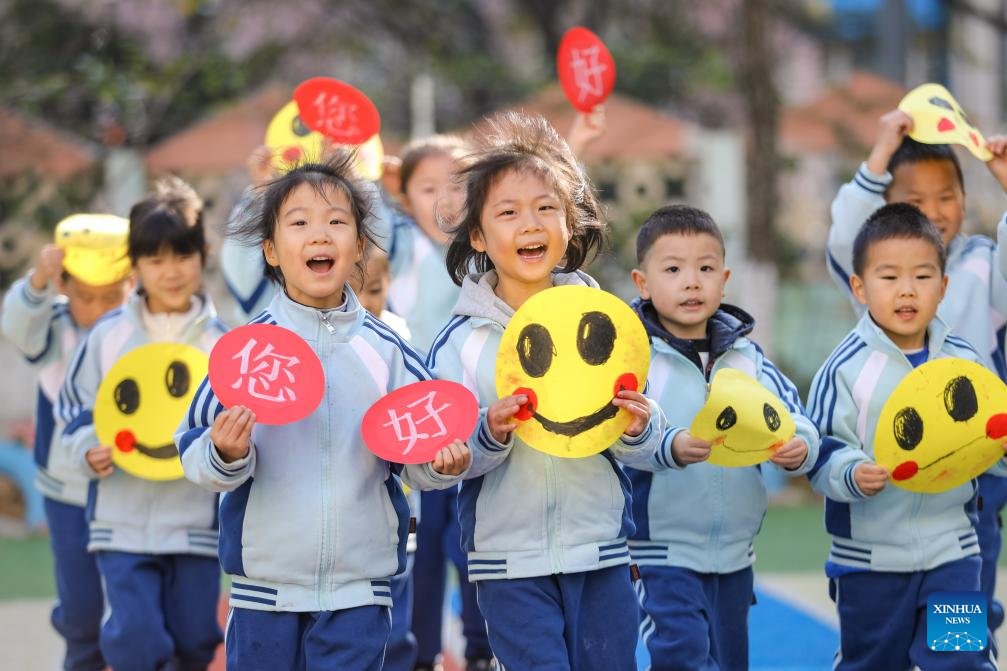 Children participate in a greeting game to celebrate the upcoming World Hello Day, which falls on Nov. 21 annually, at a kindergarten in Rongcheng, east China's Shandong Province, Nov. 20, 2025. (Photo by Li Xinjun/Xinhua)