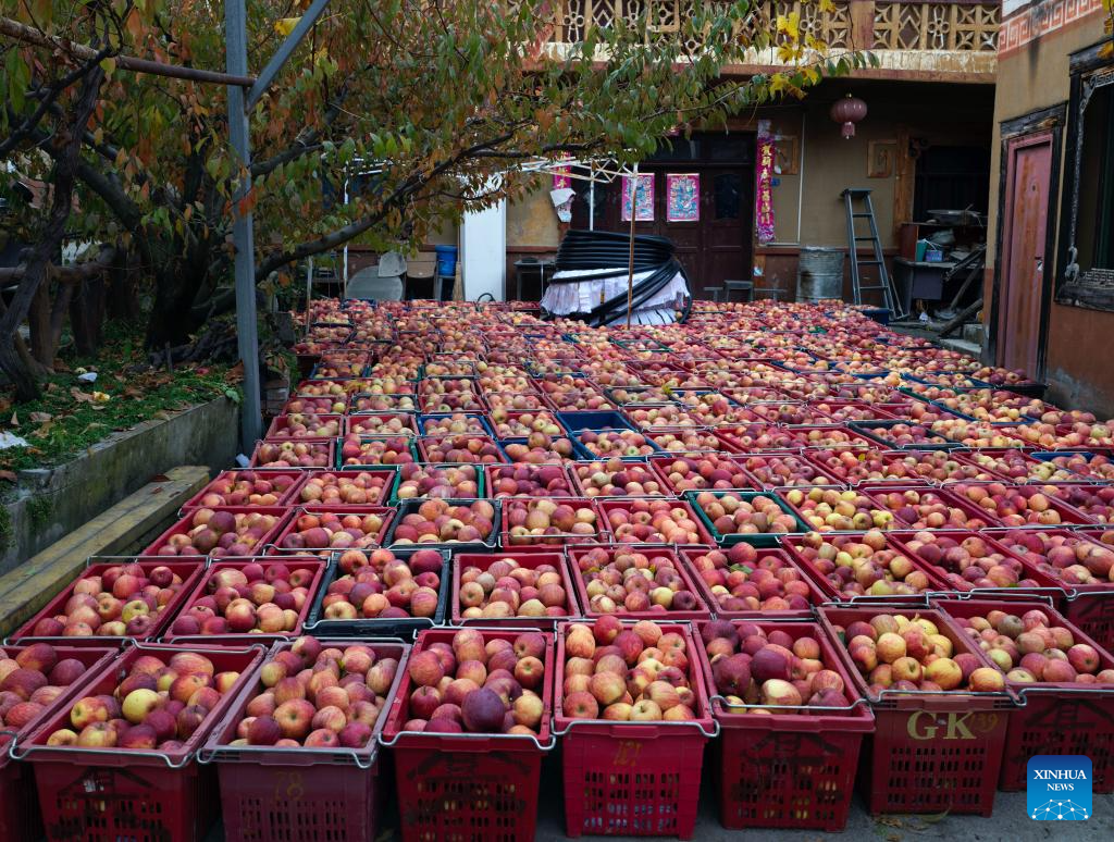 Apples are packed for transportation in Anxiang Village of Nanxin Town, Maoxian County of Aba Tibetan and Qiang Autonomous Prefecture, southwest China's Sichuan Province, Nov. 20, 2025. Over 1,000 mu (about 66.67 hectares) of apple orchards in Nanxin Town of Maoxian County have entered the harvest season. Local villagers take good use of the apple harvest to develop tourism and e-commerce, which has promote apple sales and boosted villagers' incomes. (Photo by Lan Hongguang/Xinhua)