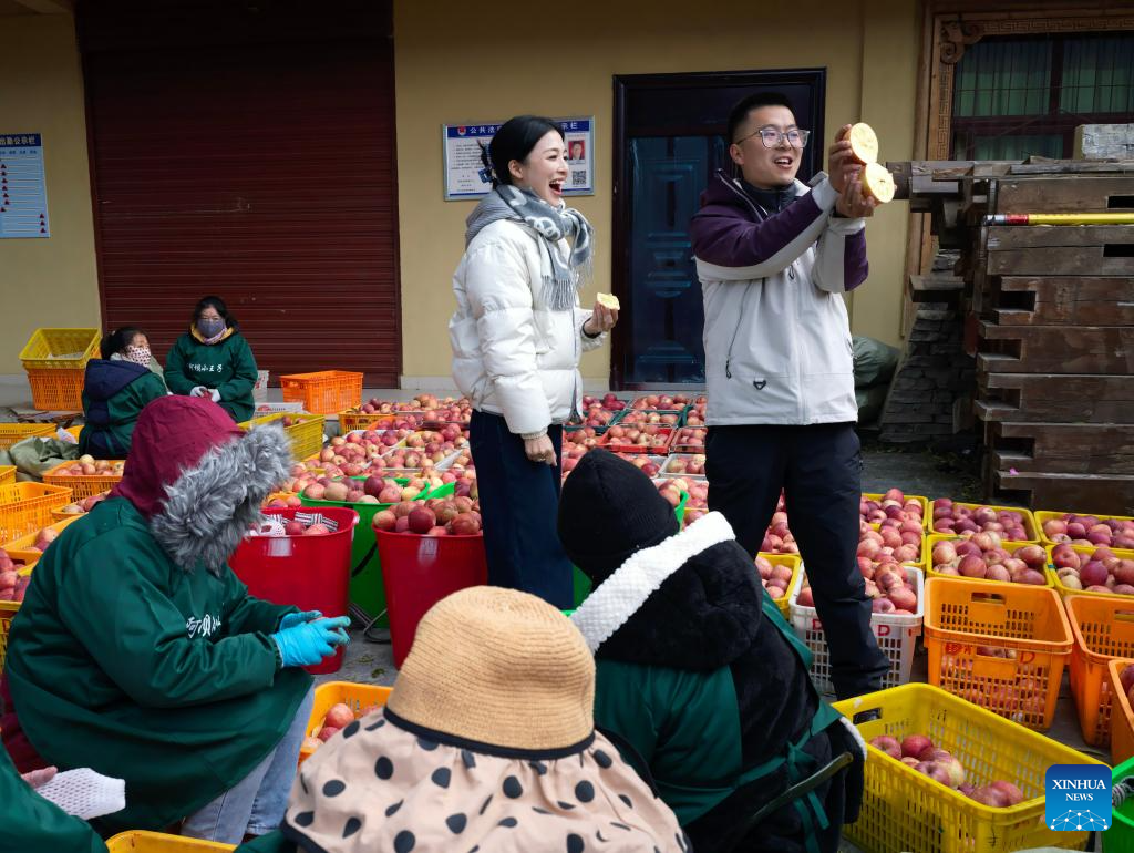 Staff members sell apples via live-streaming in Anxiang Village of Nanxin Town, Maoxian County of Aba Tibetan and Qiang Autonomous Prefecture, southwest China's Sichuan Province, Nov. 20, 2025. Over 1,000 mu (about 66.67 hectares) of apple orchards in Nanxin Town of Maoxian County have entered the harvest season. Local villagers take good use of the apple harvest to develop tourism and e-commerce, which has promote apple sales and boosted villagers' incomes. (Photo by Lan Hongguang/Xinhua)