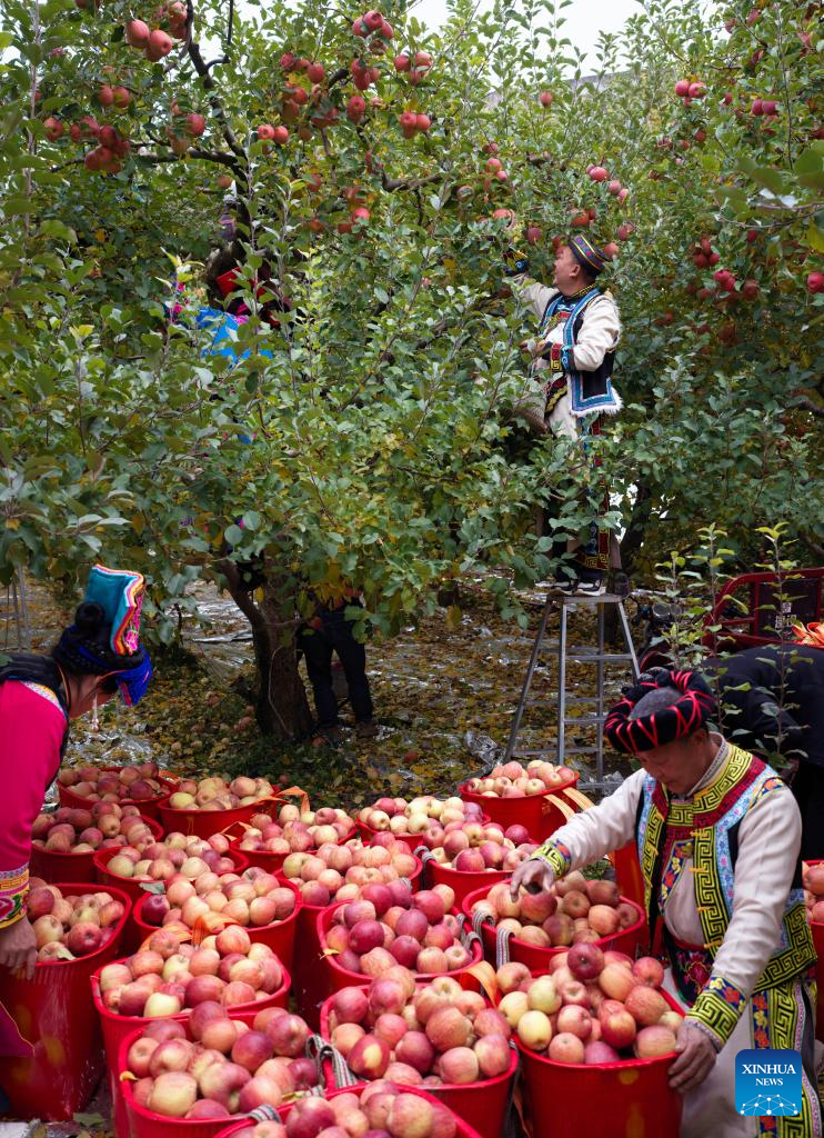 Villagers harvest apples in Anxiang Village of Nanxin Town, Maoxian County of Aba Tibetan and Qiang Autonomous Prefecture, southwest China's Sichuan Province, Nov. 20, 2025. Over 1,000 mu (about 66.67 hectares) of apple orchards in Nanxin Town of Maoxian County have entered the harvest season. Local villagers take good use of the apple harvest to develop tourism and e-commerce, which has promote apple sales and boosted villagers' incomes. (Photo by Lan Hongguang/Xinhua)
