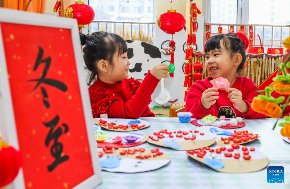 Children make tanghulu, China's iconic crispy fruit snack, with their teacher at a kindergarten in Jiyuan City, central China's Henan Province, Dec. 18, 2025. People all over the country held diverse events on Thursday to mark the Winter Solstice, which will fall on Dec. 21 this year.