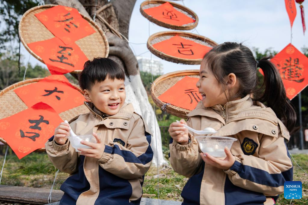 Children enjoy tangyuan at an event marking the Winter Solstice in Lucheng District of Wenzhou City, east China's Zhejiang Province, Dec. 18, 2025. People all over the country held diverse events on Thursday to mark the Winter Solstice, which will fall on Dec. 21 this year.
