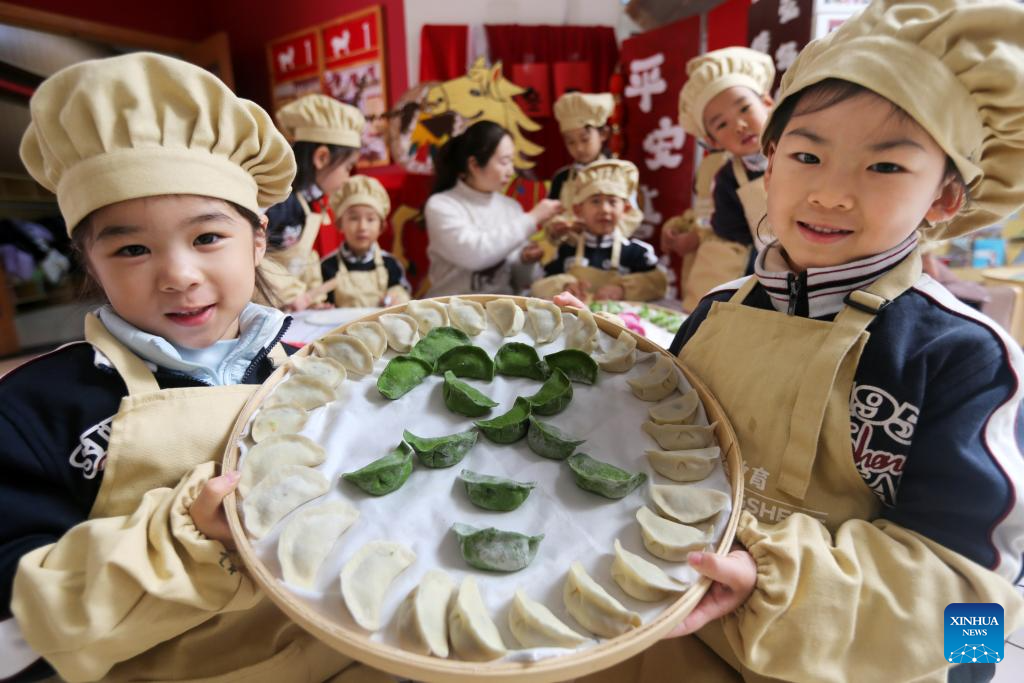 Children of a kindergarten make dumpling-shaped crafts in Tangshan City, north China's Hebei Province, Dec. 18, 2025. People all over the country held diverse events on Thursday to mark the Winter Solstice, which will fall on Dec. 21 this year.