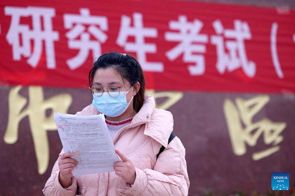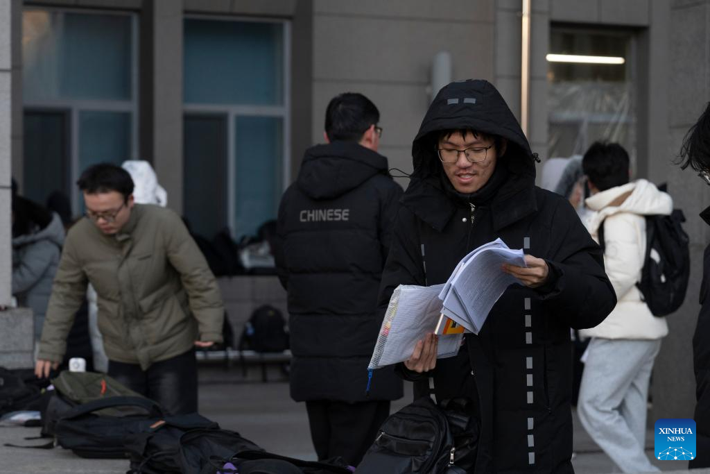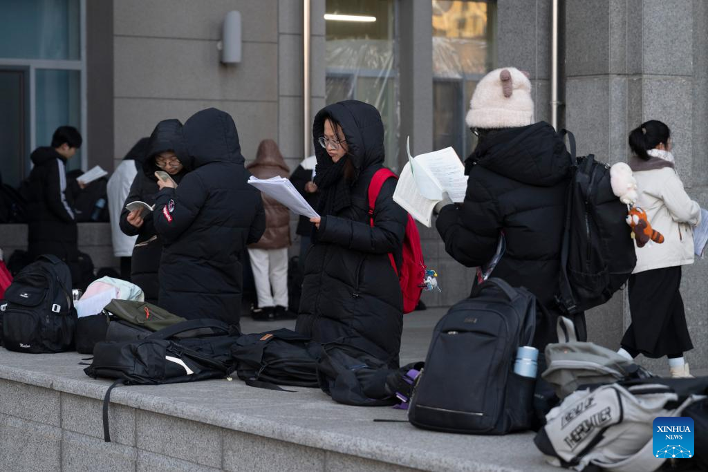 Examinees review their study materials outside an examination site for the 2026 postgraduate entrance exam in Harbin, northeast China's Heilongjiang Province, Dec. 20, 2025. China's national exam for postgraduate enrolment kicked off on Saturday. (Xinhua/Zhang Tao)