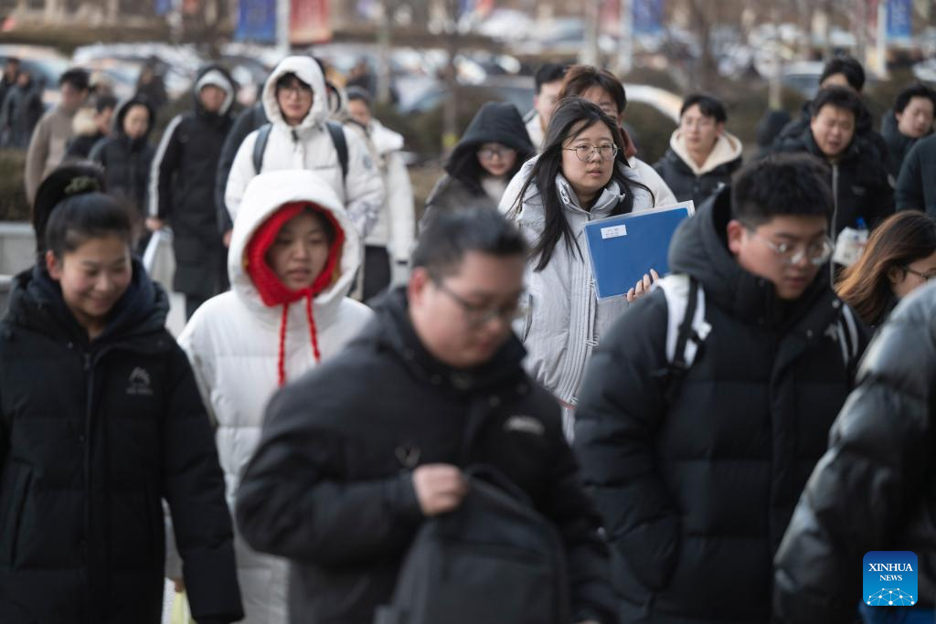 Examinees prepare to enter an examination site for the 2026 postgraduate entrance exam in Harbin, northeast China's Heilongjiang Province, Dec. 20, 2025. China's national exam for postgraduate enrolment kicked off on Saturday. (Xinhua/Zhang Tao)