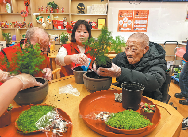 Volunteers teach elderly people how to trim bonsai at a community center in Beijing on Oct 24. XIA ZILIN/XINHUA