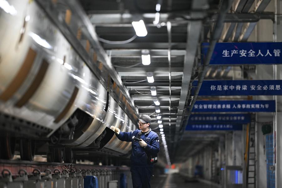 A staff member conducts maintenance work at a high-speed train base in Nanjing, east China's Jiangsu Province, Jan. 28, 2026. (Photo by Yang Suping/Xinhua)