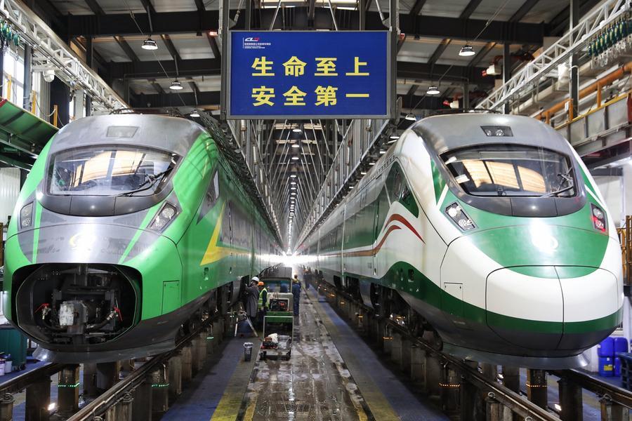 Staff members conduct maintenance work at a high-speed train base in Kunming, southwest China's Yunnan Province, Jan. 29, 2026. (Photo by Yang Zixuan/Xinhua)