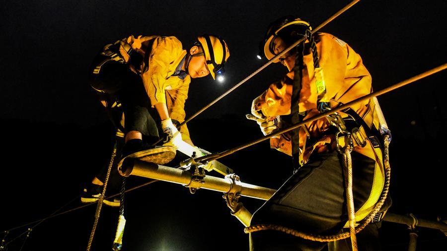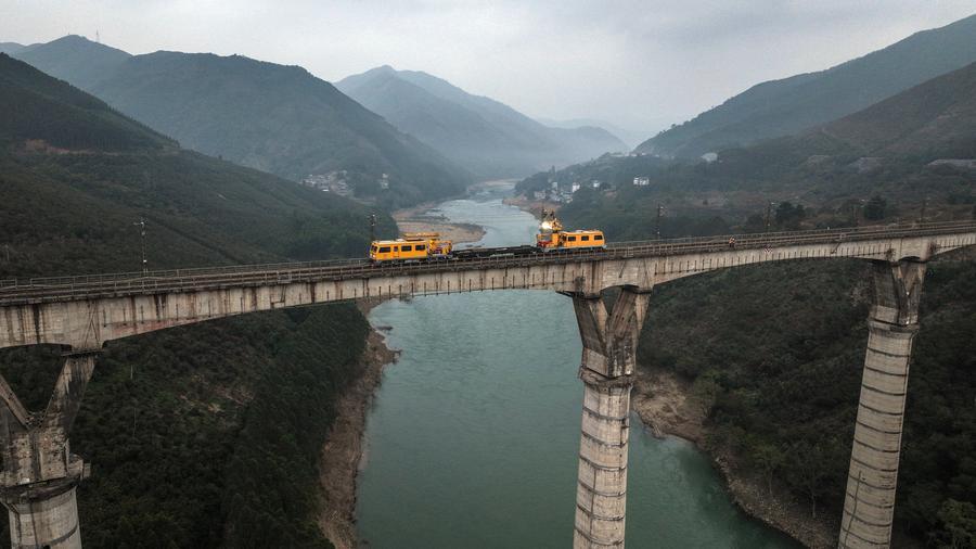 Workers of China Railway Nanning Group Co., Ltd conduct maintenance work in south China's Guangxi Zhuang Autonomous Region, Jan. 29, 2026. (Xinhua/Zhang Ailin)