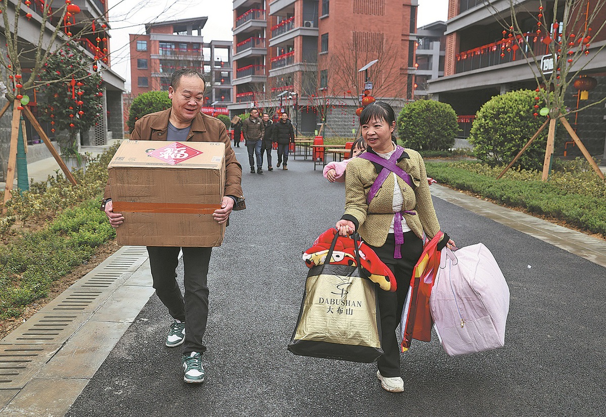 Disaster-affected residents receive free supplies at a resettlement community in Yibin's Jinping village, Sichuan province, on Saturday. After a landslide on Feb 8, 2025, local authorities moved quickly to carry out resettlement, enabling residents to settle into new homes before this year's Spring Festival. Jiang Hongjing/Xinhua