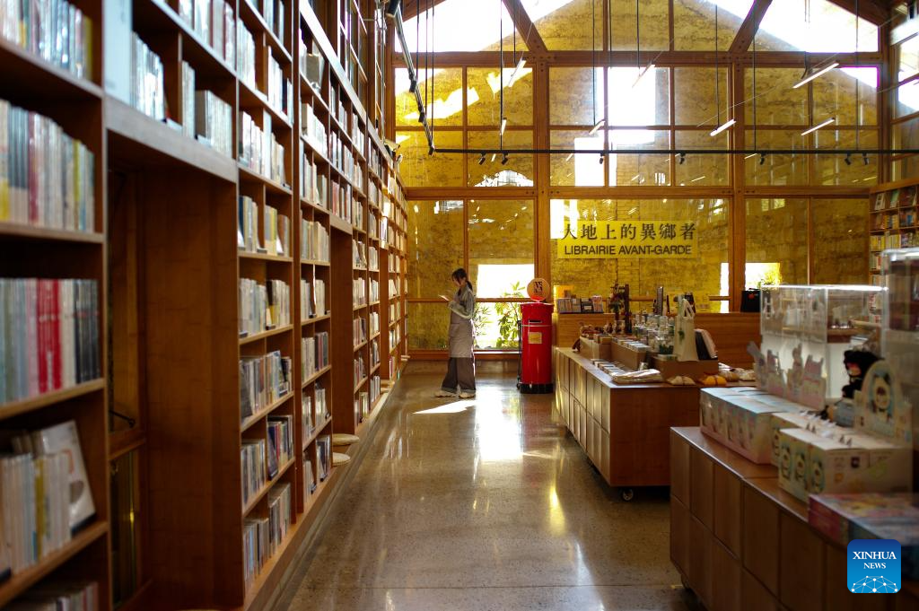 A staff member arranges books at Huize rural bookstore of Librairie Avant-Garde in Baiwu Village of Huize County, southwest China's Yunnan Province, March 24, 2026. (Xinhua/Zhang Cheng)