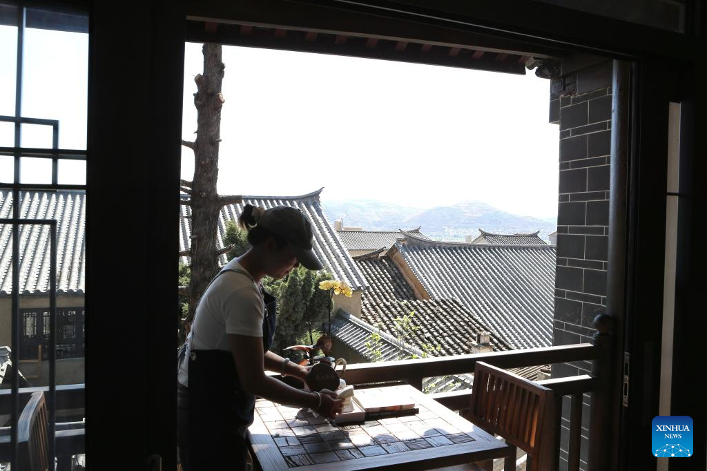 A staff member does the cleaning at a homestay in Baiwu Village of Huize County, southwest China's Yunnan Province, March 24, 2026. (Xinhua/Lin Liping)