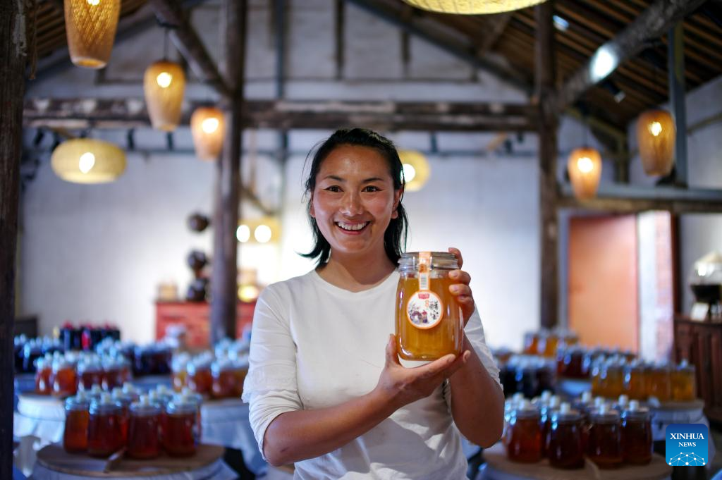 A villager shows a local beverage in Baiwu Village of Huize County, southwest China's Yunnan Province, March 24, 2026. (Xinhua/Zhang Cheng)