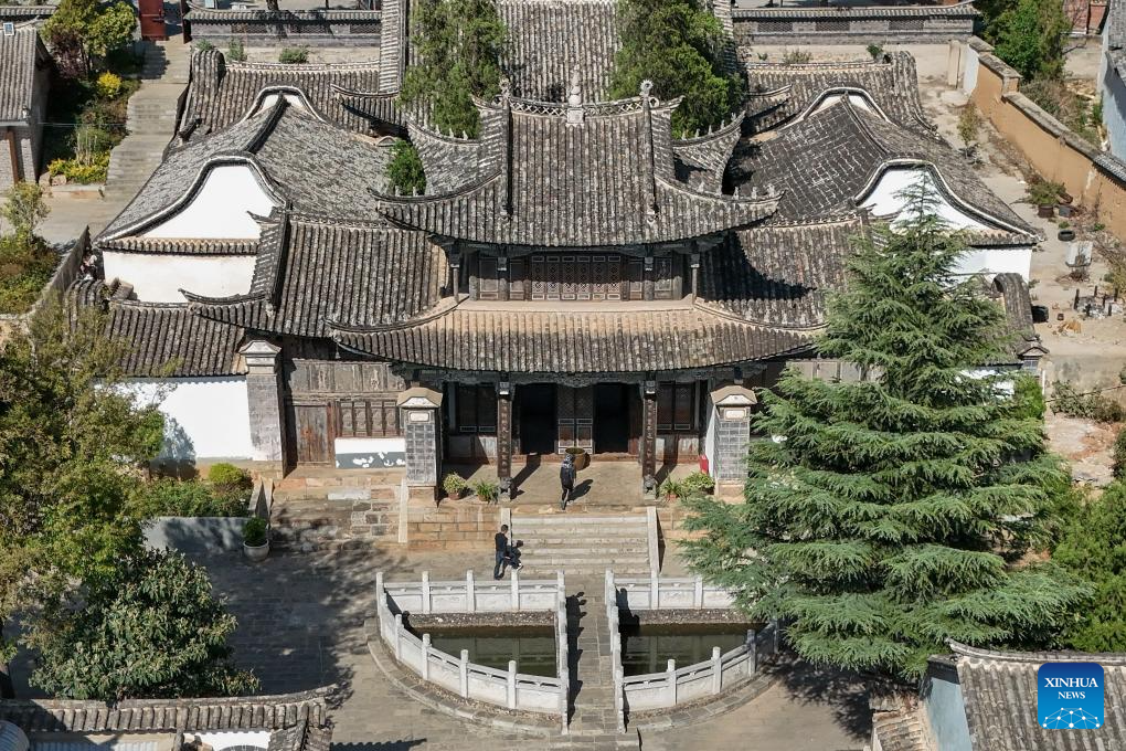 An aerial drone photo taken on March 24, 2026 shows ancient dwellings in Baiwu Village of Huize County, southwest China's Yunnan Province. (Xinhua/Peng Yikai)