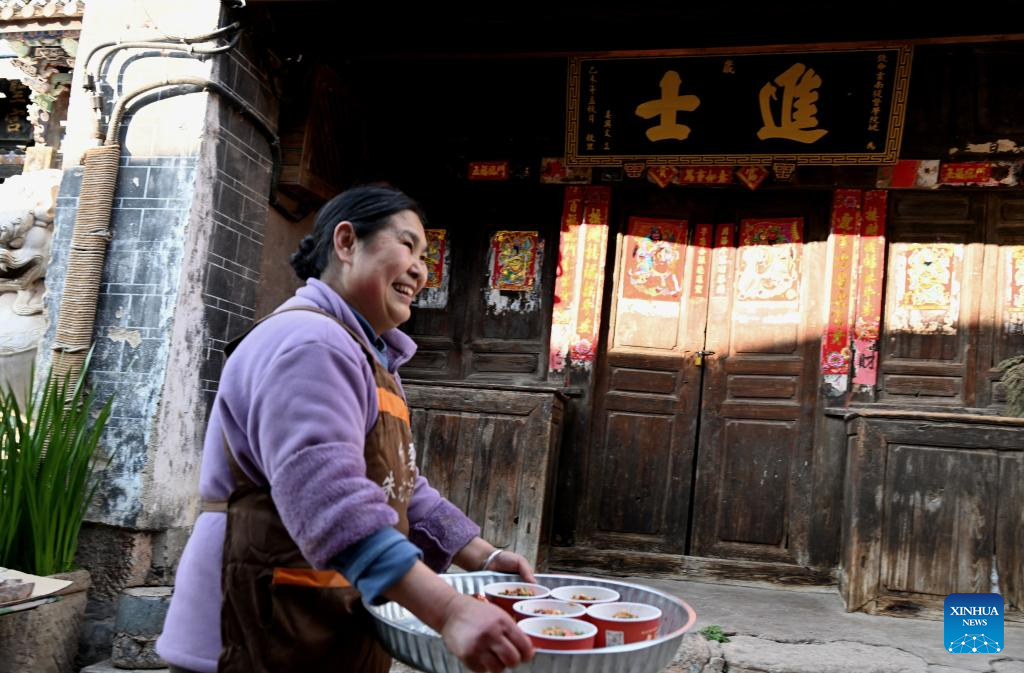 A villager serves cold bean jelly noodles in Baiwu Village of Huize County, southwest China's Yunnan Province, March 24, 2026. (Xinhua/Huang Xiaoyong)