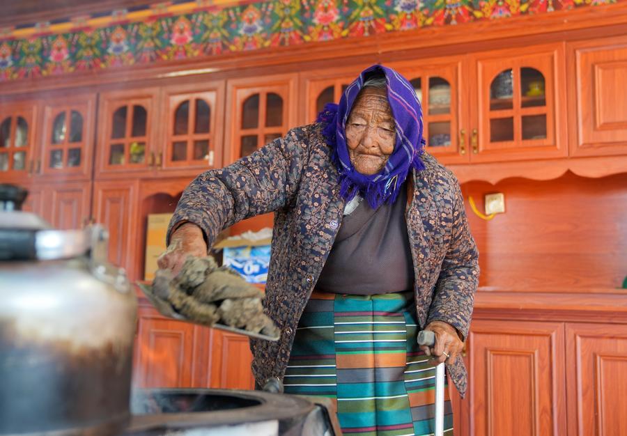 Konjo Chodron adds fuel to a stove at home in Nyemo County, Lhasa City, southwest China's Xizang Autonomous Region, March 6, 2026. (Xinhua/Jigme Dorje)