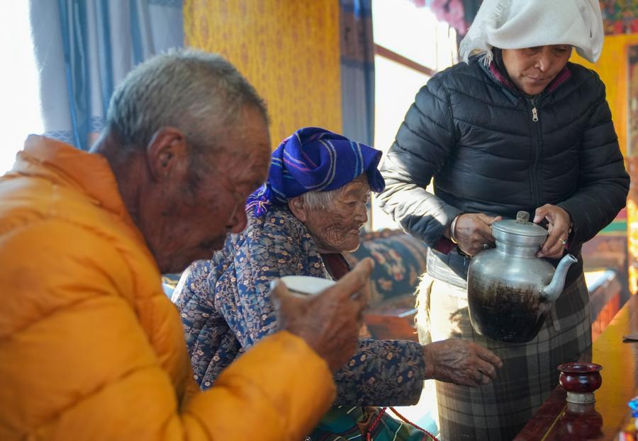 Konjo Chodron (C) drinks tea with her family at home in Nyemo County, Lhasa City, southwest China's Xizang Autonomous Region, March 6, 2026. (Xinhua/Jigme Dorje)