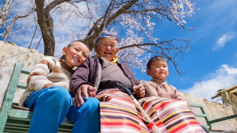 Tsering Sangmo (C) and her great-grandsons sit in her yard in Zongkhar Village of Shannan City, southwest China's Xizang Autonomous Region, March 26, 2026. (Xinhua/Jigme Dorje)
