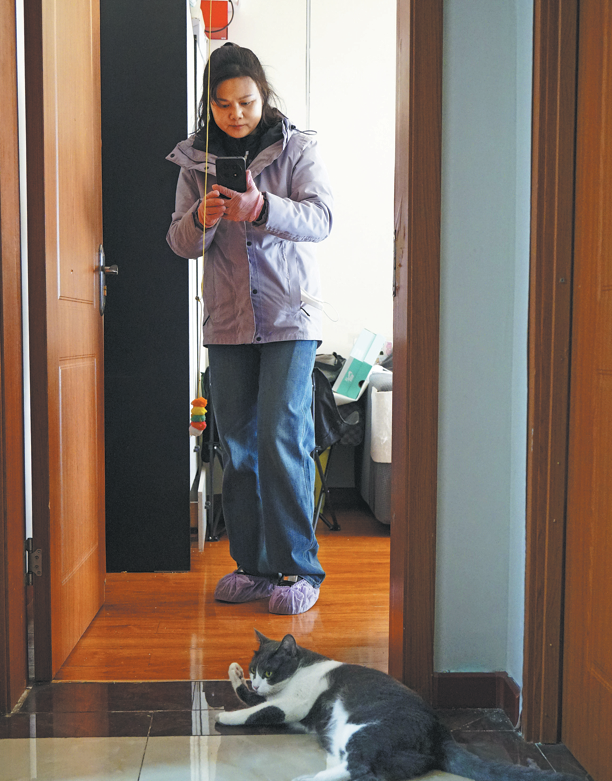 Pet sitter Chen Hong uses her mobile phone to document her work at a residential complex in Taiyuan, Shanxi province, on March 28. ZHANG AO/FOR CHINA DAILY