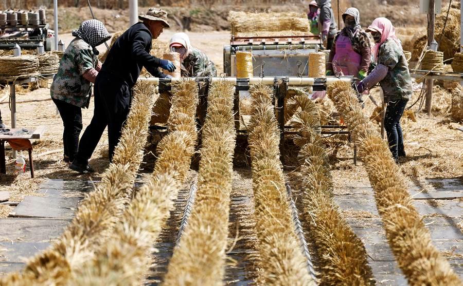 People make straw ropes at Heilin Village in Zhongwei, northwest China's Ningxia Hui Autonomous Region, April 10, 2026. (Xinhua/Wang Peng)