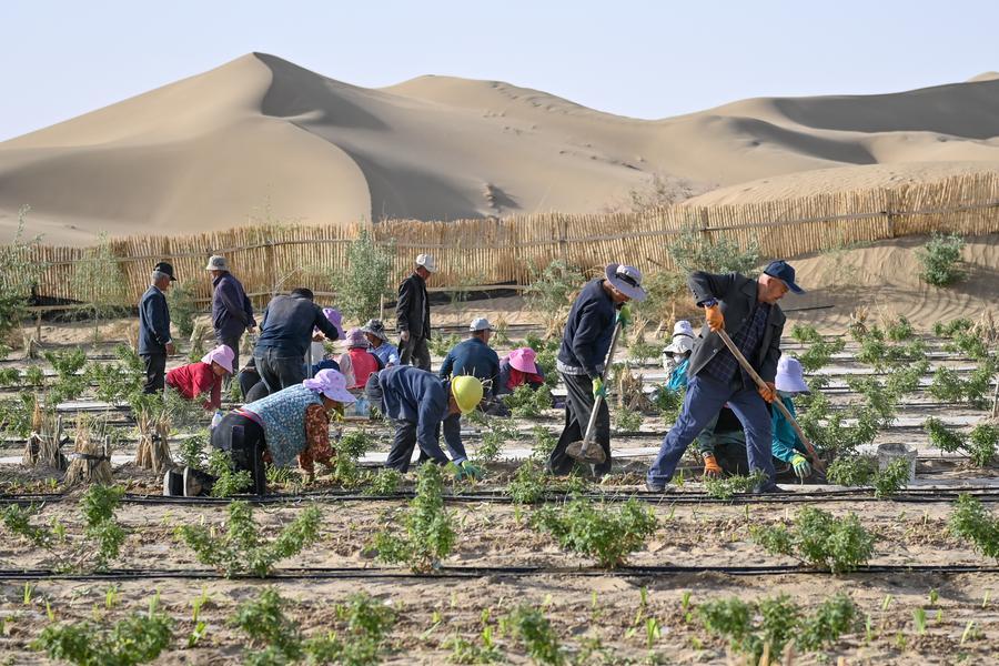 Villagers plant Belamcanda chinensis, a plant used in traditional Chinese medicine, at a garden in Yutian County, northwest China's Xinjiang Uygur Autonomous Region, April 15, 2026. From medicinal plants to flourishing fruit orchards, these green barriers are not only curbing desertification of Taklimakan Desert but also invigorating local industries. (Xinhua/Ding Lei)
