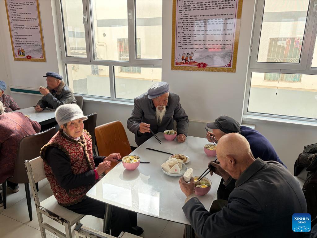 Senior residents have meals at an elderly service center in Shanhai Xincun Community in Chankou Town of Dingxi City, northwest China's Gansu Province, Feb. 3, 2026. (Xinhua/Cheng Nan)